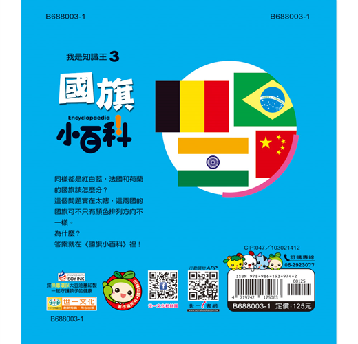 你知道中華民國國旗的顏色有什麼涵義嗎? 你知道哪個國家的國旗不是長方形嗎? 國旗是國家的臉,本書除了介紹43面國旗的意義與由來之外,還介紹國花、政府使用的官方語言及各國的世界之最,並且附內容音檔QR CODE,可以隨掃隨 時聽!透過國旗,了解世界上多采多姿的各國文化,成為胸襟寬大的世界公民。