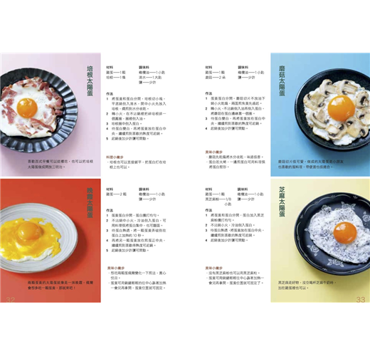 太陽蛋要煎得美,要先煎蛋白、最小火冷油慢煎,蛋才不會煎得滿臉泡泡、金沙料理,用鹹蛋黃更鹹香夠味、菇類先煸再和蛋一起料理,不易出水香氣也更足、番茄炒蛋先用油炒出番茄紅素,番茄的好滋味才會完美釋出……加點小技巧,料理的美味更上層樓。