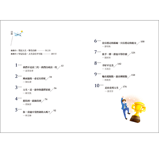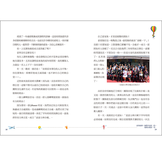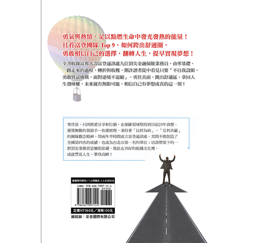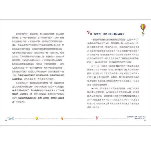 這是一本溫暖、勵志、點燃你希望之火的一本書,藉團隊裡來自不同家庭、背景、年紀的菁英群角度,傳遞保險價值及每一個人對自己都該有的「肯定、相信、堅持」的力量。
