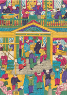 千金丹原本是從朝鮮傳來的藥品,最初傳到對州(長崎縣對馬市),明治時期也進軍大阪安土町(今大阪市中央區)設廠,卻在第二次世界大戰期間燒毀。據悉,明治14年(1881)左右,對州的住永家族和大阪的信山家族之間,曾爆發千金丹的正統之爭,但右邊這組商人的叫賣台詞卻是「對州」和「信山家傳」兩者夾雜(在P.14的玩具繪則是寫著「正宗大阪安土町」)。左邊那組是小孩在玩模仿叫賣千金丹的遊戲。