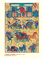 這輛載滿乘客的馬車是明治5年(1872)開業的公共馬車,行駛於東京的新橋和淺草之間。小朋友對飛快奔馳的馬匹感到好奇,興致勃勃地逐步靠近。馬夫則大聲喝斥:「讓開!危險!」