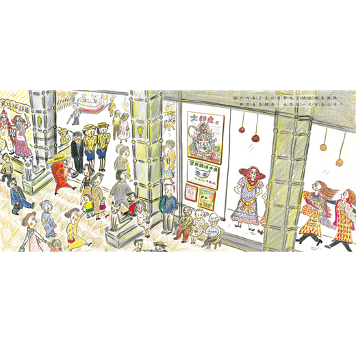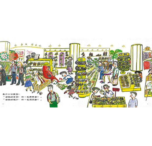 本書的插畫,出現了許多值得細細品味的人、事、物。有平凡的主婦、上班族,以及小朋友、老先生,也有印度女人、坐輪椅的人、帶著導盲犬的人。而不同賣場裡的店員,他們工作的神情,也十分逼真。插畫細膩的呈現出百貨公司的各個部門,同時畫中含有豐富的故事,是生活學習的好材料。