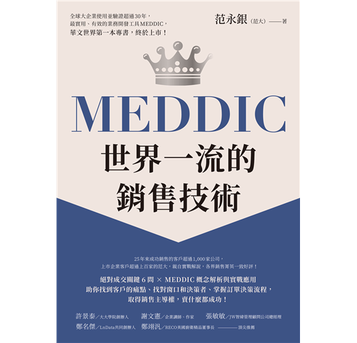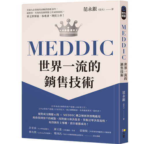 「MEDDIC是一套協助公司業務成功銷售的關鍵方法,運用這套系統化的邏輯結構和執行技巧,業務能更高效地進行銷售。范大傳授的MEDDIC銷售法,除了協助業務更全面、具體地分析工作專案的狀態,更讓我們學習掌握重要的關鍵因素,達成工作任務!」惟傑科技顧問/謝雅玉