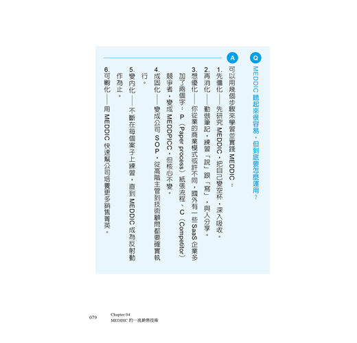 「MEDDIC提供了一個有組織系統性的業務檢查方式,幫助銷售了解當下到了哪個階段,還有哪些資訊沒有評估到,才能有效管理自己的案子。」力新國際文件自動化處/Phyllis