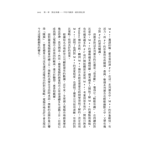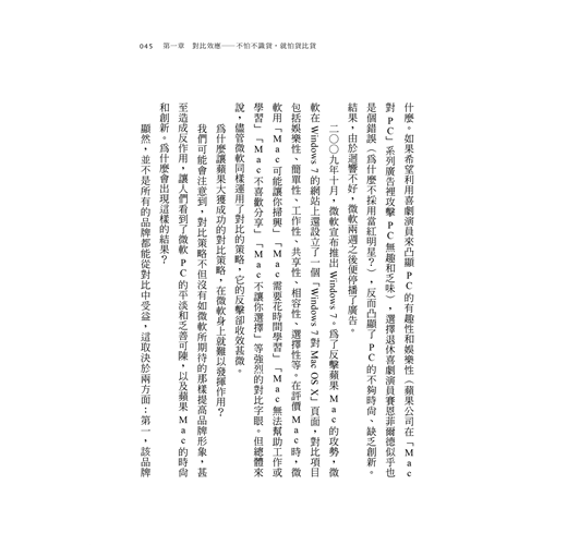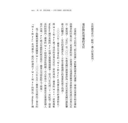 .如何讓滯銷商品變暢銷?/.對比效應/.啤酒實驗/.《經濟學人》雜誌實驗/.從無人問津到銷量翻倍/.生活中的對比效應/.大東西和小東西/.利用對比效應的廣告/.基於對比效應的定位/.微軟的反擊/.黑莓機的慘敗/.互扔泥巴的選舉戰爭