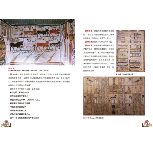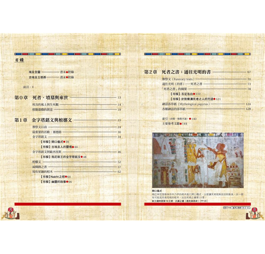 本書以古埃及人的「生死-復活」觀點為經緯,介紹埃及法老使用的「金字塔文」,以及名門貴族繼承這樣的觀念所使用的「棺槨文」。