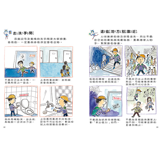 不論孩子現在幾歲,都要和他一起閱讀這本安全繪本,書中以遊樂園、百貨公司、游泳池、博物館等不同公共場所為例,告訴孩子該做與不該做的行為;以及搭乘不同交通工具時應遵守的規矩會,都是必要的生活常識。