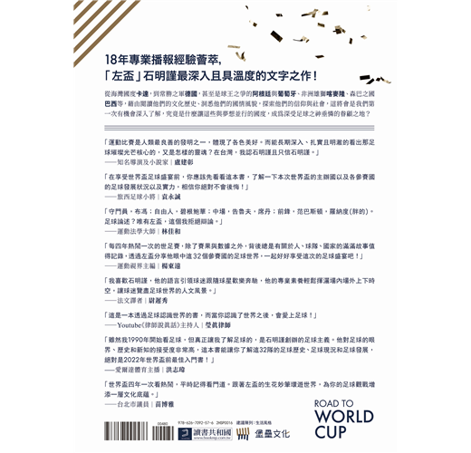 從2022年世界盃舉辦國的海灣國度卡達,到常勝之軍德國,甚至是球王之爭的阿根廷與葡萄牙、非洲雄獅喀麥隆等,在這三十二隊薈萃、強者雲集的競技場中,我們將不只能看見他們華麗的球技與天衣無縫的團隊默契,更能看到隱藏在他們球衣之下,那更具血肉與歷史的時間重量。