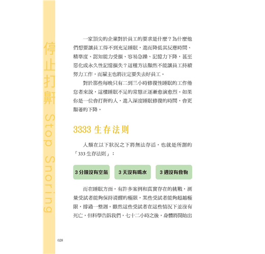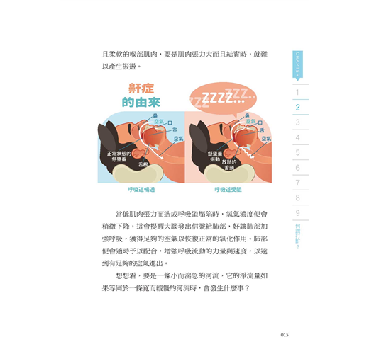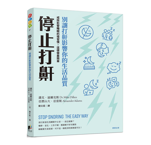 打鼾對生活的影響絕對超乎你的想像,不僅因自己無法有足夠的恢復性睡眠時間、危害健康,更將你與伴侶的距離愈拉愈遠!擁有三十多年臨床經驗的耳鼻喉科顧問醫師,邁克.迪爾克斯醫師設計的「五分鐘運動」,幫助打鼾者消除影響深層睡眠的壞習慣,隨之而來的各種正向效益,將令你驚喜不已。