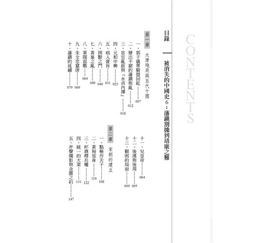 從唐晚期到北宋,以藩鎮宦官之禍、黃巢之亂、五代十國、宋朝建立、杯酒釋兵權、王安石變法、靖康之難為內容,生動、活潑、有趣的白話描述,最好看、最好懂的中國史故事──《被消失的中國史》,第六冊:藩鎮割據到靖康之難。