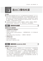 國貿業務乙級技術士證照考試除了學科外,還有術科,其單元分為基礎貿易英文、貿易流程圖、商業信用狀分析、單據製作與出口價格核算等題型。書中依據最新Incoterms 2020貿易條規編寫,並加入111年〈技術士技能檢定「國貿業務」職類規範修正草案〉新增之內容,系統化整理各章節內容加以解說,並依據勞動部範例題予以分析,最後再配合歷屆試題解析,讓你在理解各章內容及考題的同時,也能增強解題技巧。其中因勞動部所公布的測驗試題範例與一般國際貿易書籍的計算方式大不相同,但卻有脈絡與公式可循,故書中詳細列出範例中的各個公式,並仔細列出了每一個步驟的計算過程,只要你跟著書中解說的內容再搭配公式運用,那麼對於各種出口價格核算的問題皆可得心應手,手到擒來。