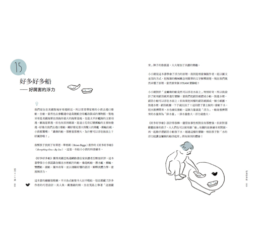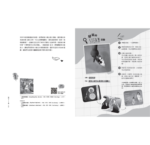 旅美親子作家曾多聞,在居家期間精選超過90本經典繪本,透過親子共讀引導,設計出44個適合全家一起玩的實驗活動,從寶寶數學、自然、科學,到兒童工程學、社會科學等,透過親子實際操作,將STEAM教育自然融入遊戲中,培養具備 STEAM 素養的小科學家!