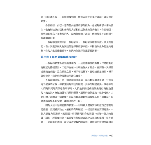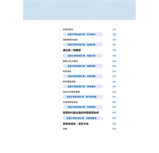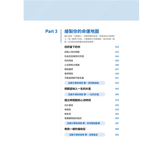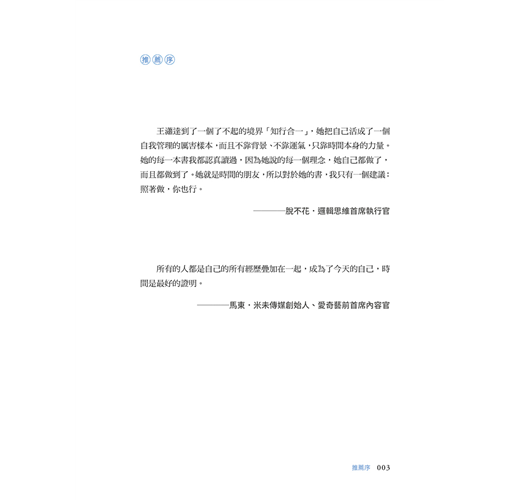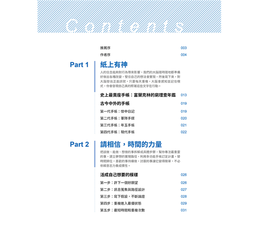 其設計的商品《趁早效率手帳》自2013年銷售至今,已成功幫助百萬名使用者在工作、生活與學習上獲得改善。在眾多見證回饋後,重新修訂18種最具效果的行動計畫,提供本書讀者練習使用。能幫助整合策略思考、專案管理、個人計畫、效率系統、反思提問、調校心態、動力驅使,培養耐心與專注力。