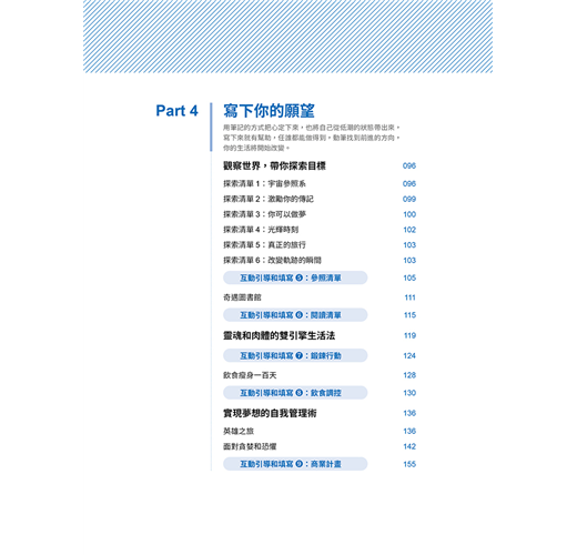 藉口很多,行動很少,你把時間花在哪,就會成為什麼樣的人,從一連串小作為、小選擇與小決定開始,每天前進一點點,你也能完成想要的目標和成果。總是想著「我已經很忙了,不想給自己找麻煩」的你,別擔心!本書介紹的方法非常簡單。只需要一個筆記本、一支筆,沒有難以模仿的技巧,不需要寫作天分,不必太用力,每天保持幾分鐘熱度。