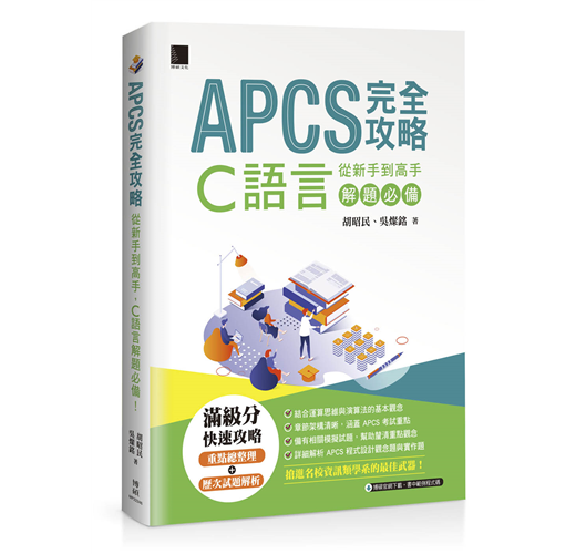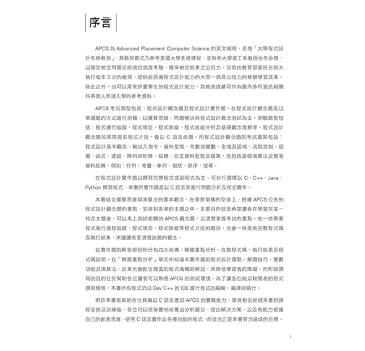 同時也可以參考附錄的內容來幫助自己熟悉 APCS 的測試環境。此外,為了讓學習者以較簡易的環境撰寫程式,本書所有程式以 Dev C++ 的 IDE 進行程式的編輯、編譯與執行。希望透過本書的課程安排與訓練,可以讓學習者培養出以 C 語言應試 APCS 的實戰能力。
