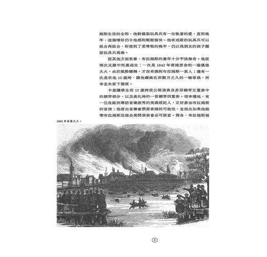 從其他方面來看,布拉姆斯的童年十分平淡無奇。他從兩次災難中死裏逃生︰一次是1842年席捲房舍的一場漢堡大火,由於風勢驟轉,才沒有燒到布拉姆斯一家人;還有一次是在他10歲時,讓他癱瘓在床數月之久的一樁車禍,所幸並未留下傷痕。