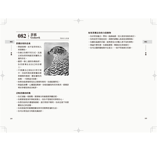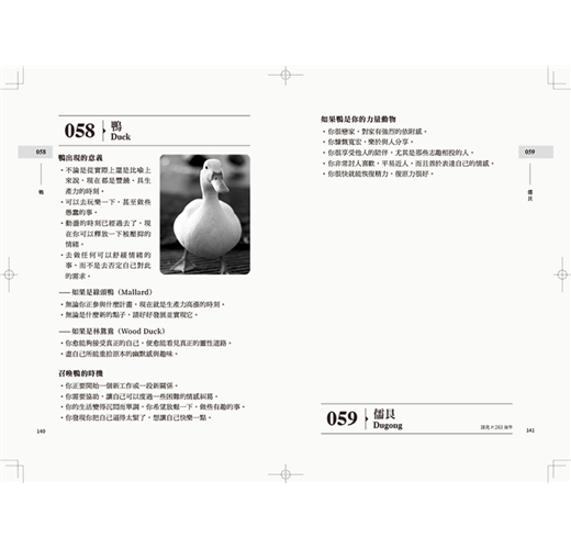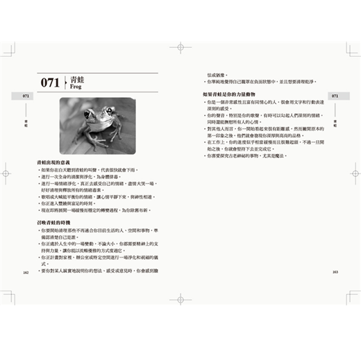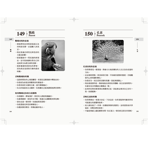 閉上雙眼深呼吸、放鬆身體,在心中提問,一邊反覆翻著〈第1章〉頁面,直到你想停止為止。該動物及其內容,就能為你提供指引。
