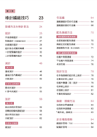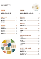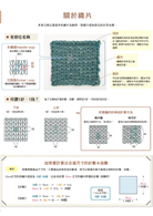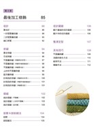 第4章	織品加工修飾:完成作品的所需織片後,凡是最後固定針目的收針、收縫;織片的併縫&綴縫、藏線、整燙技巧,以及毛球、流蘇等能夠提升織品完成度的技巧都匯集在此,這些細節往往是決定作品精美程度的重點,不可小看喔!