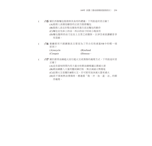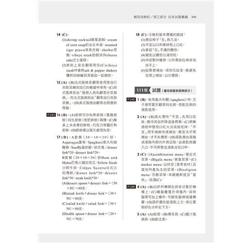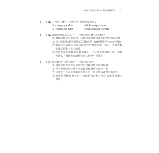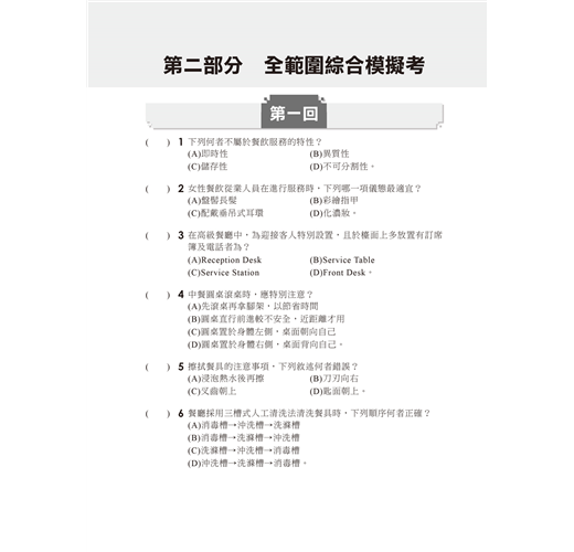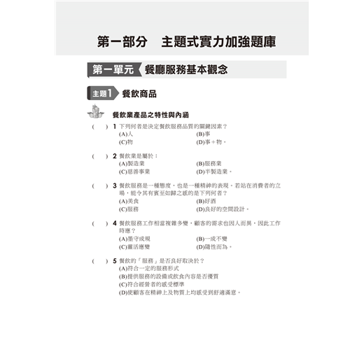 第一部分為主題式實力加強題庫,針對「餐飲服務」一科,根據108課綱考試範圍,針對精華試題,編列經典範題及解析。盼透過各類重點考題、題庫之匯整與逐題解析,可以從題目之演練中,熟知考試趨向與題型;並於經典範題及解析之後,更進一步針對各類考試重點,提供變化題、延伸題、綜合題型等之進階試題演練,以藉由淺而深的試題演練與解析,得收融會貫通、打通任督二脈之效。