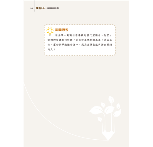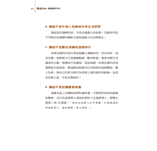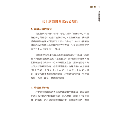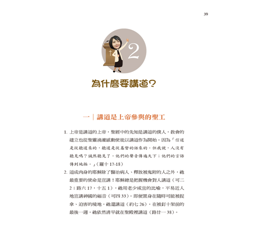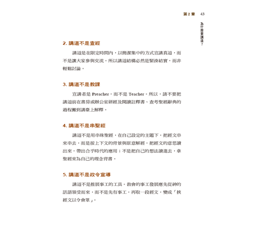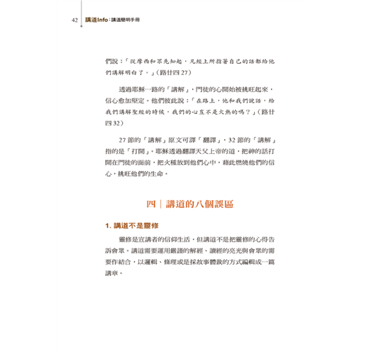筆者也希望透過本書,從講道的 information經歷 transformation,讓資深的講道者重新反省,自己的宣講是否不再有熱情,而只是一種政令宣導或例行公事,或早已無道可講,只能東拼西湊,抑或甘脆播放講道影片讓別的牧者幫我們代勞?求主再次開我們的心竅,使我們明白聖經,領受從上頭來的能力,得以奉祂的名傳悔改、赦罪的道(參路廿四 45-48),並透過這恩惠的道建立神的子民(徒二十 32)。