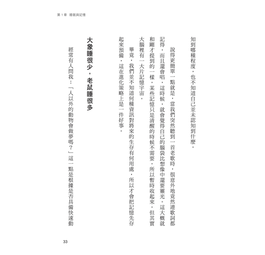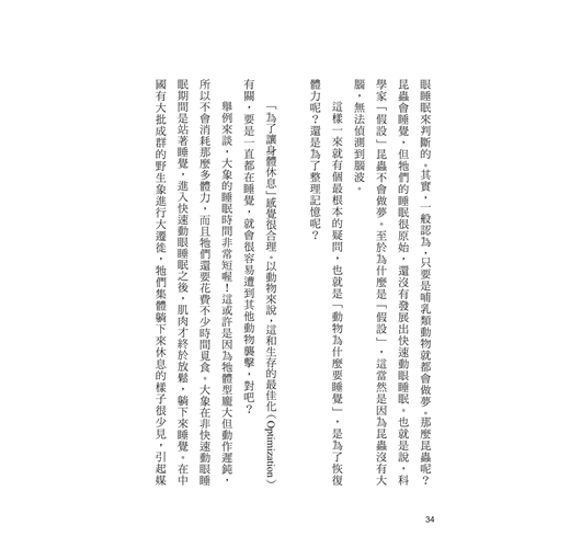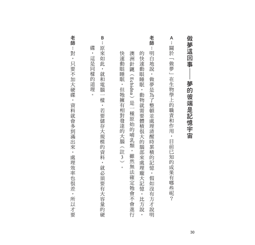 老師:明白地說,做夢是為了整頓並處理清醒時累積的記憶。假如沒有方才說明的快速動眼睡眠,動物就需要體積很大的腦部來處理龐大記憶。比方說,澳洲針鼴(Echidna)是一種原始的哺乳類,雖然無法確定牠會不會進行快速動眼睡眠,但牠擁有相對發達的大腦(註3)。