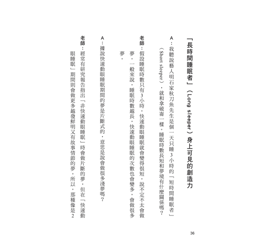 老師:你們還年輕,卻都這麼無欲無求啊?(笑)開開玩笑啦!我也曾經對夢境的解讀結果感到無法釋懷,但過一段時間就突然不再做夢了。當我頻繁做夢的時候,就是我正在煩惱人生出路的時期,一旦方向確定後,就突然不再做夢了,因此我想這其中一定有什麼玄機。別人以夢裡出現的象徵來分析夢境,但我想要以不同形式來研究做夢的原理和意義,這就是一切的開端。雖然花了一段相當長的時間就是了。