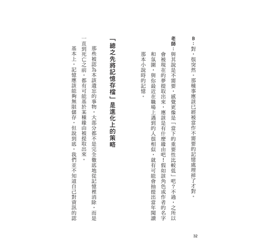 畢竟,我們並不知道何種資訊對將來的生存有何用處,所以才會把記憶先存起來預備,這在進化策略上是一件好事。