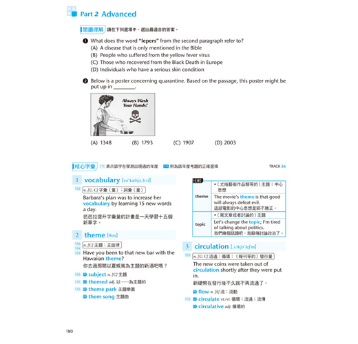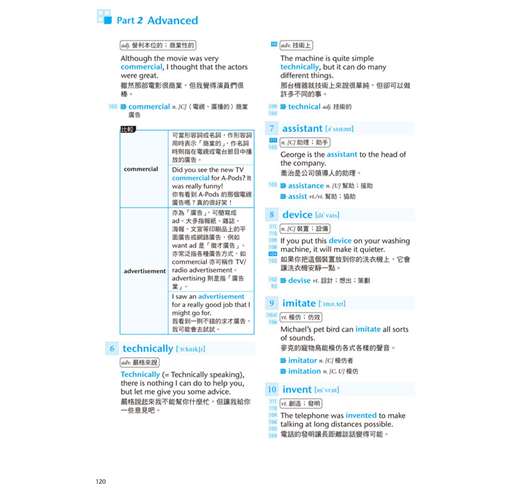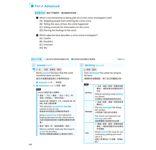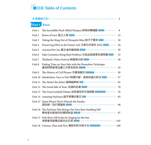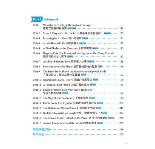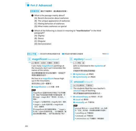 本書分為Part 1: Basic「基礎篇」與Part 2: Advanced「進階篇」兩大部分,總計共含三十六個單元。每單元先藉由閱讀範文來認識字彙,再透過全面性的單字解說熟練每字的重要用法,最後再從課後練習立即驗收學習成效。按照本書穩紮穩打的學習步驟相信能有效累積大考必備的字彙量,游刃有餘地面對升大學考試。