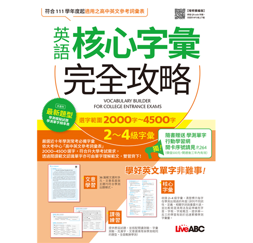 《英語核心字彙完全攻略》是一本針對升大學考試而設計的字彙書。單字的編纂參考大考中心所頒布111學年度起適用之「高中英文參考詞彙表」,此參考詞彙表分為六級,而本書選用的是其中第二級至第四級的字彙。此範圍的單字在學測試題用字中占了相當大的比例,不僅是理解文章類考題(克漏字、文意選填、閱讀測驗等)的基礎,更是詞彙題最主要的出題範圍。只要能熟悉第二至四級字彙,就等於掌握了基本分。