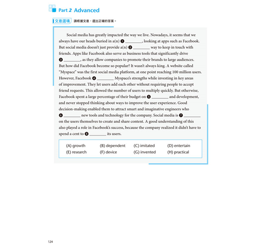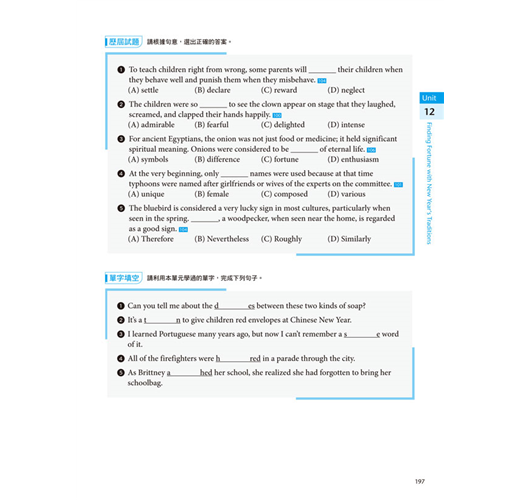每單元除了提供歷屆試題之外,亦有閱讀理解、詞彙測驗、克漏字、文意選題等與學測相同的題型。另特別納入單字填空以幫助學生加強拼字能力。
