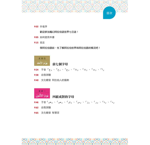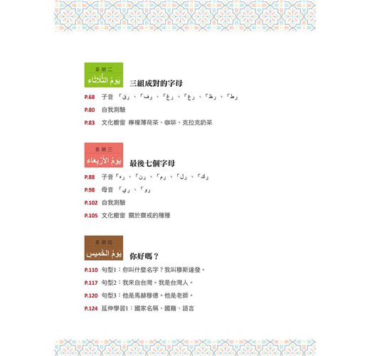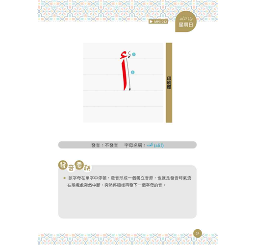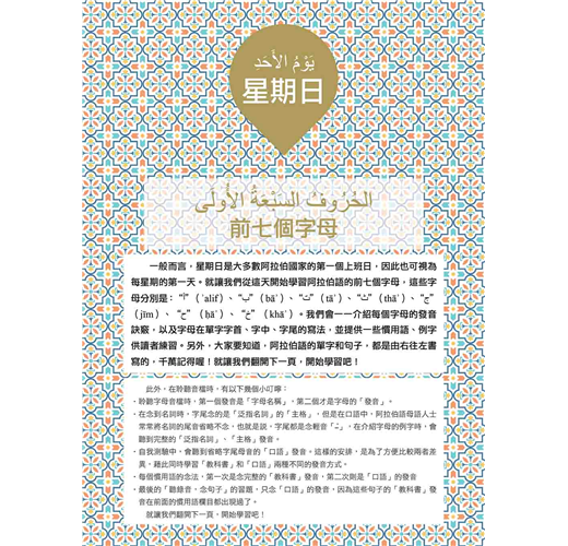 阿拉伯語字母不必一天就學會!且讓本書從星期日到星期三,先以四天的時間,陪伴您一起學習阿拉伯語的二十八個字母和三種標音符號。