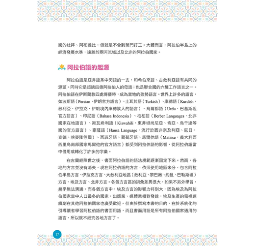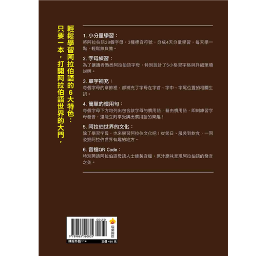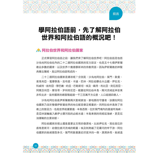 本書在開始學習前,先帶您了解關於阿拉伯語的種種,包含阿拉伯世界究竟有哪些國家?阿拉伯語的使用範圍、使用人口有多少?這些在「前言」中有詳細說明。相信您了解這些背景知識之後,對這個謎樣世界的語言,一定會更想一探究竟!