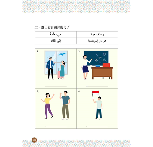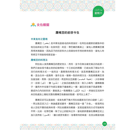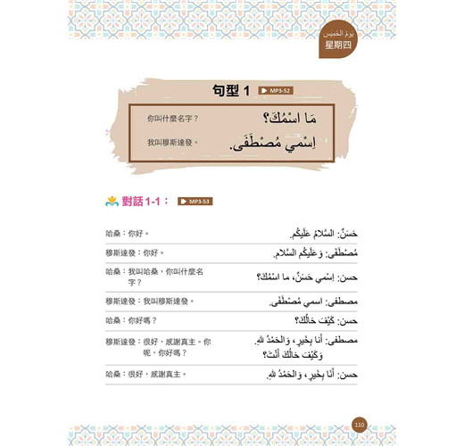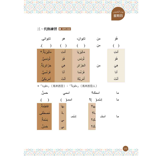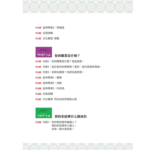 介紹句型後,開始練習對話,對話內容循序漸進,讓阿拉伯語融入實際生活中,讓您學習起來更有樂趣喔!