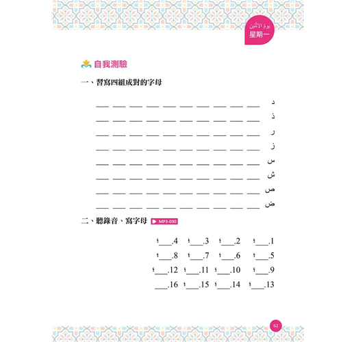 將阿拉伯語28個字母、3種標音符號,分成4天分量學習,每天學一點,輕鬆無負擔。