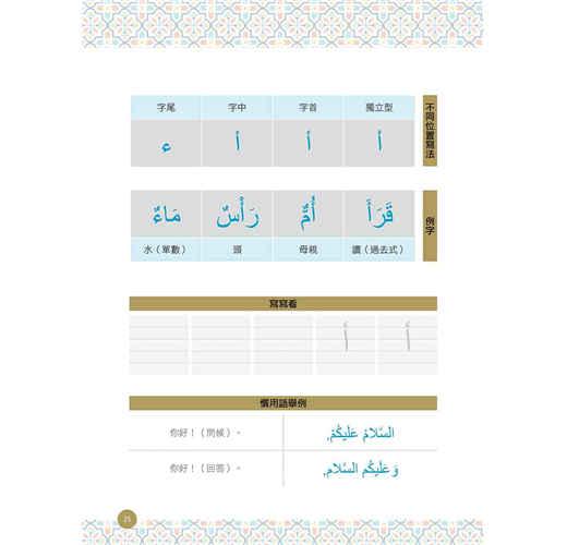 為了讓讀者熟悉阿拉伯語字母,特別設計了5小格習字格與詳細筆順說明。
