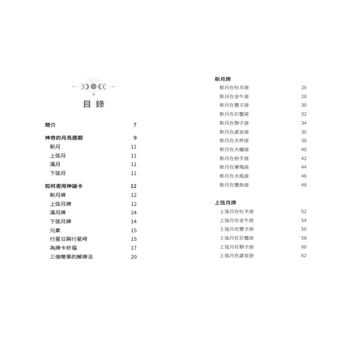 48張牌卡結合月亮週期的四個主要月相──新月、上弦月、滿月、下弦月,以及黃道十二宮星座的魔法能量。每一張牌都擁有自己獨特的訊息、頻率和力量,將揭露你當前正在顯化的內容,以及這些能量如何影響你日常生活中的情緒和體驗。