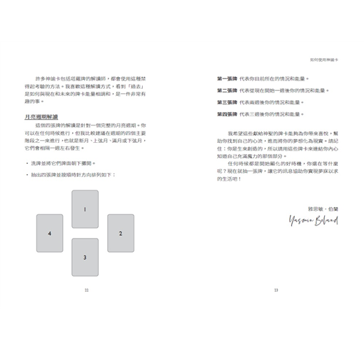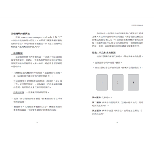 說明書中除了解說牌卡訊息,還有如何利用每一張牌獨特的能量,提供具體的指導,以及可操作的儀式等。例如: