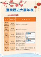 隨書整理在臺灣歷史上占舉足輕重的事件一覽表,幫助同學迅速瀏覽橫跨三百多年歷經多方立場不同的統治的時期下,屬於臺灣的獨一無二的歷史淵源。