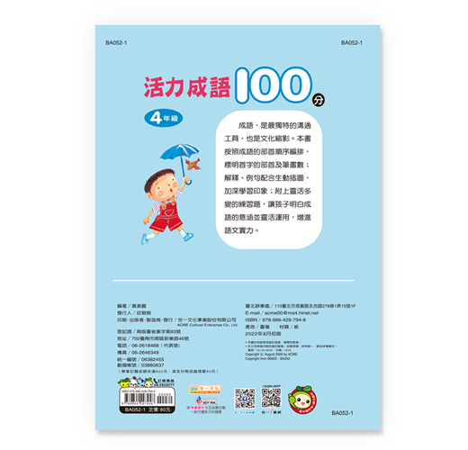 成語,是最獨特的溝通工具,也是文化縮影。本書按照成語的部首編排,標明首字的部首及筆畫數;解釋及例句配合生動的插圖,加深學習印象;附上靈活多變的練習題,讓孩子明白成語的意涵並靈活運用,增進語文實力。