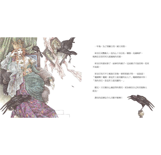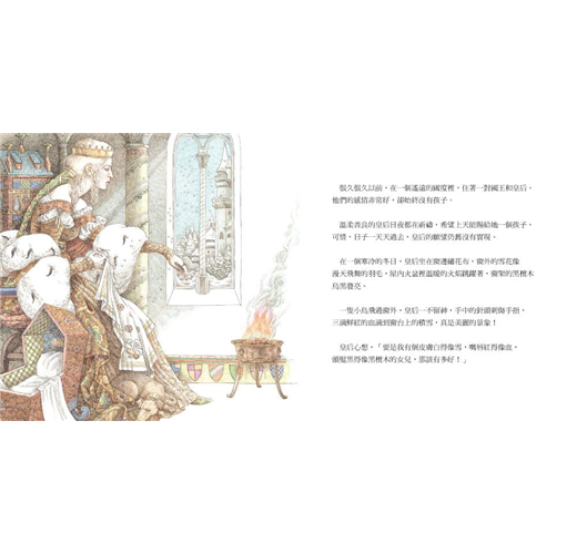 有哪位插畫家能如實畫出〈白雪〉,讓讀者從細節中看見不一樣的驚喜?對細節精雕細琢、一絲不苟的尹芳吉伯與丹尼納諾夫婦正是不二人選。他們不僅畫出〈白雪〉的關鍵片段,更加入許多需要細細觀賞,才會發現的元素。例如利用角落空蕩蕩的搖籃來表示皇后的求子心切,以及當忌妒的壞皇后看著鏡中貌美的白雪時,在構圖上運用令人不寒而慄的元素渲染畫面情緒。我們還能看到白雪在故事中頭戴花冠,除了彰顯她純真可人的個性,更為她標緻的美貌增添光采。在眾多細節的安排下,插畫家讓讀者看見清新脫俗的白雪。尹芳吉伯以她最擅長的色鉛筆作畫,營造暈染的效果與細膩精巧的筆觸,畫面斑斕迷離,令讀者陶醉其中,緩緩走入綺麗夢幻的童話世界。