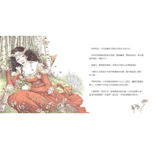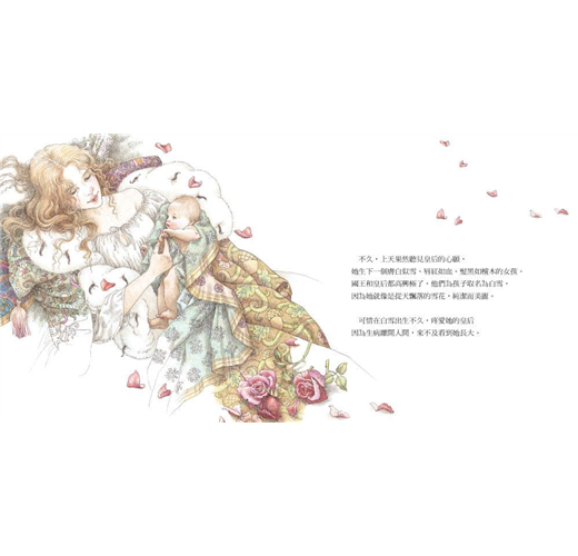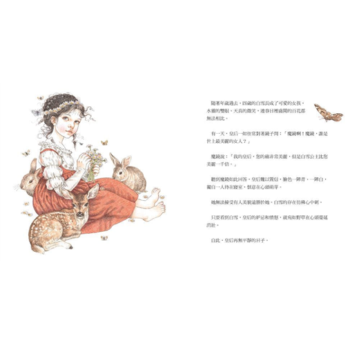 ❖繪本大師尹芳吉伯和丹尼納諾繪製經典童話〈白雪〉,唯美細膩的筆觸、精巧雅致的插畫,為故事注入新生命。