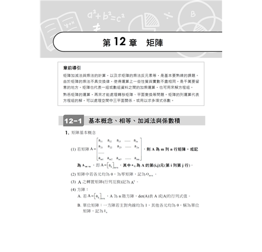 本書內容之編寫是配合108課綱數學甲之範圍做各單元的分類,輔以有系統的整理,提供詳細解析與破題要訣,讓考生破除背公式的迷思,改以邏輯思考方式來解題,透過觀念釐清的基礎以及試題的勤加練習,勢必讓考生事半功倍,締造考試佳績,對於考生在準備數學這一科必定有莫大的幫助。