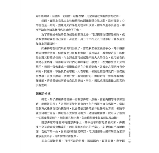 總之,為了累積功德就須一再觀想佛陀。然後,當能夠觀想得很淸楚時,就應該思考:「這佛陀是從何而來的?住在哪裡?會去哪裡?」當以這個方式檢測自己的觀想時,就會體悟到佛陀並非從任何地方來,佛陀不在任何地方停留,佛陀也不去向任何地方。透過這種禪修,就可以了悟到一切現象都是無生、無住而且無止盡,如此修行而生起智慧以及功德。