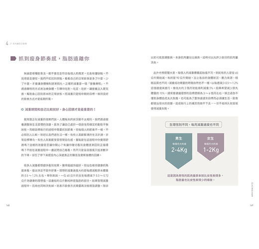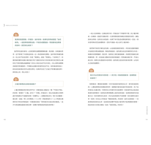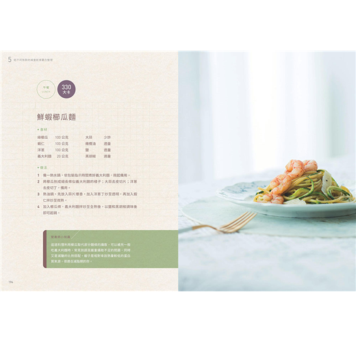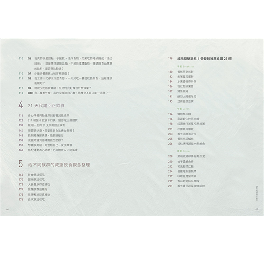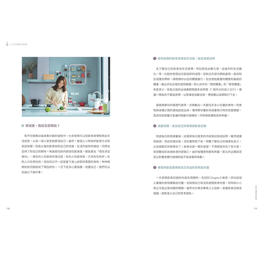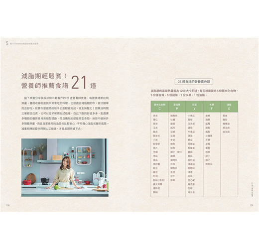 如果你願意下廚,書中也附上21道由營養師親自設計及示範的減脂食譜,每道菜做法簡單、口味多變、營養素和份量也都精算好,讓你減重期間不挨餓,從「食」感受原型食物的美味營養和療癒能量。