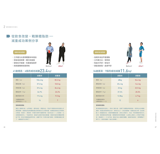 工作壓力很大的禮丞是外食族,不了解健康飲食要如何執行,規劃療程時請他先控制攝取蛋白質和碳水化合物的量,每天吃足5~6份蔬菜,晚餐提前於7點前吃完,2個月後他的體脂率開始下降,減重不到1年的期間再次做健檢,發現脂肪肝竟消除了!