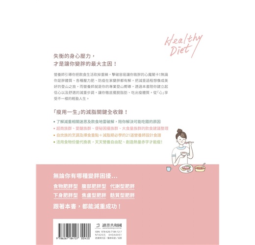 人生很難,總總的生活壓力讓你不得不吃、就是想吃、隨便亂吃!會變胖大多是因為身心失衡的緣故,從「食」傾聽心理真正的缺乏,讓營養師陪你把飲食生活砍掉重練,個個擊破容易讓你致胖的心魔關卡!無論你是胖體質、各種壓力肥、防疫在家變胖都有解,把減重過程想像成美好的登山之旅,而營養師就是你的專業登山嚮導,透過本書陪你建立起信心以及舒適的減重步調,讓你徹底擺脫脂肪、吃出瘦體質,從「心」享受不一樣的輕盈人生。