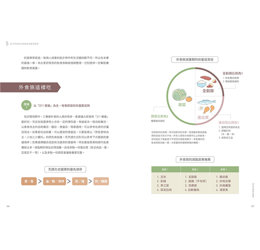 運用211餐盤+飲食8口訣+份量計算與代換,只要認真執行21天,就有機會讓身體的負循環重回正循環,許多診間個案都覺得這套方法很受用,完全顛覆他們的刻板觀念,因為不僅無壓力又能吃飽超滿足!營養師特別設計出「4週減重計劃」以及「1~4個月的營養療程目標」,只要如實跟著做,6個月減下10公斤並不難!此外,營養師也針對不同族群,整理出外食族、超商族、大食量族群、愛醣族群、易便秘族群、自炊族的飲食建議,幫助大家執行減重計劃時能找到適合自己的方式,減少痛苦指數。