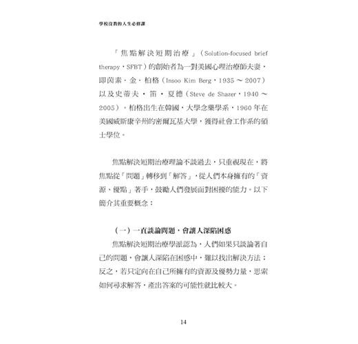 例如,過去我因為不認識自己的人格特質,導致放棄諸多機會,後來讓我經常深陷在人生意義的困惑中。在此種情況下,我開始學習《易經》、《聖經》、佛經、紫斗八字及諮商心理學,雖然心靈被滋養豐富了,但仍沒解決我的問題。當我讀到焦點解決短期治療理論的論點,才啟發我開始思考自己所擁有的資源。