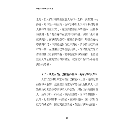 本書取名為「學校沒教的人生必修課」非常貼切,隨著科技的發展、虛擬世界的盛行、宗教信仰的滑落、社會愈來愈多元、個人的自由及選擇愈來愈多,「人對於自己的了解愈來愈重要」,當我們了解自己天性或性格上的缺陷時,如能加以調整或修正,則自己看自己或事情的角度就會有所改變,進而有較正確的情緒及行為。畢竟一切的行為都由個人的思維所驅動,沒有好的思維,就不會有成熟的態度及行為,希望讀者讀了本書後,能有所體會,從而邁向幸福的人生。