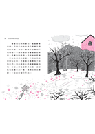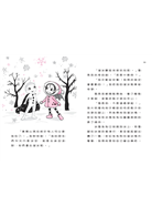 【第二章】 接下來的週末兩點整,前門響起了清脆的「叩、叩、叩」敲門聲。我跑去打開門,一陣夾帶著雪花的強風便吹進了走廊。 「莎莎!」克莉絲朵阿姨邊喊邊把我拉向她,給了我一個冰冰涼涼的擁抱。她比我記憶中的樣子還漂亮,長長的銀色頭髮隨風飛揚,秀髮上迷你的雪花閃閃發光,手上還提著看似用冰打造的行李箱。 「克莉絲朵阿姨,真高興妳來了!」我接過她手上的行李箱後,趕緊又放了下來,畢竟它實在太冰了。 「小寶貝,我也好開心再見到妳呀!」克莉絲朵阿姨高聲喊著。「這裡和我在北極的舒適小冰屋差好多喔。這裡不怎麼下雪,對吧?」 「對呀,」我說。「好希望這裡也有雪喔!我聽媽媽說妳們小時候常常會一起去溜冰。」 「喔,對呀!」克莉絲朵阿姨說。「真的很好玩唷!莎莎,妳有溜過冰嗎?每個人至少都該體驗過一次!」 「沒有耶。」我說,心裡再次羨慕起奧立佛。「我朋友奧立佛今天舉辦生日派對,還邀了一些朋友一起去溜冰,可是我沒有受到邀請,因為溜冰很貴。」 「是啊,如果是去城市裡的大溜冰場,確實很貴,」克莉絲朵阿姨說。「不過如果妳跟我一樣是雪仙子,可就一點也不貴了!走,我們到後院的花園去吧!」 我興奮的拉起克莉絲朵阿姨的手,帶她走到後門。克莉絲朵阿姨推開門,和我一起望著屋外的花園,然後她舉起仙女棒……咻──! 隨著雪花閃閃發光,星星嘶嘶作響,花園正中央出現了堅硬又閃亮的冰面,有如一面鏡子在陽光下閃爍著。不過冰面四周圍著綠色草地,感覺有點奇怪。克莉絲朵阿姨一定也有同樣的感覺,只見她再度揮舞仙女棒,把整座花園變成了冰雪世界。現在樹枝上閃爍著晶瑩的霜,地面上覆蓋著厚厚的雪,連空氣也感覺不太一樣,變得又冷又寧靜,一切都安靜了下來。 ★★★ 「粉紅兔兔,來吧,」我邊說邊用雙手搓出一顆雪球。「你可以來幫我!」 我把雪球放在地上來回滾動,讓雪球越滾越大。「這顆就當作雪人的身體,你想要堆雪人的頭嗎?」我問粉紅兔兔。 但是粉紅兔兔沒興趣幫我的忙。因為他也在堆雪,他想自己堆一隻兔子,一隻冰雪兔兔! 所以我只好自己堆起了雪人的頭,在花園裡四處尋找能當成眼睛和鈕扣的材料。我發現花圃邊的雪裡埋著幾顆深色的鵝卵石,便把這些小石頭塞到雪人的頭上和胸前。 我覺得他還需要其他配件,於是跑進屋裡,拿出了掛在門後的披風。這是我最愛的披風,上面綴滿星星和月亮的圖案,非常適合我的雪人。 「嗯……,這雪人好像太小了,不像個大人,不如就叫雪男孩吧!」我說。 我後退幾步,欣賞自己的作品,粉紅兔兔也後退幾步,欣賞著他的作品。雪男孩的臉上掛著我用手指畫的巨大微笑,看起來十分友善,於是我也對他露出笑容。 就在這個時候,雪男孩眨了眨眼睛,嚇得我往後一跳! 「粉紅兔兔!」我說。「你看見了嗎?」 粉紅兔兔興奮的點點頭,舉起手對冰雪兔兔揮舞。一看到冰雪兔兔揮手回應,粉紅兔兔便開心的上下彈跳。接著冰雪兔兔蹦蹦跳跳的穿越花園,粉紅兔兔也跟在她身後跳,玩起了鬼抓人遊戲! 正當我用力盯著雪男孩看時,他的頭開始慢慢的轉了起來,彷彿他從來沒用過脖子,正在測試脖子的功能似的。 「一定是魔法雪的關係!」我倒抽了一口氣說。「是有仙子魔法的雪!」 我驚訝的望著雪男孩漸漸活了過來。他舉起一隻手臂揮了揮,再伸出一條腿,踩在沒人踏過的雪地上。他的披風在身後不斷鼓動,在空中揚起一陣陣晶瑩發亮的雪花。